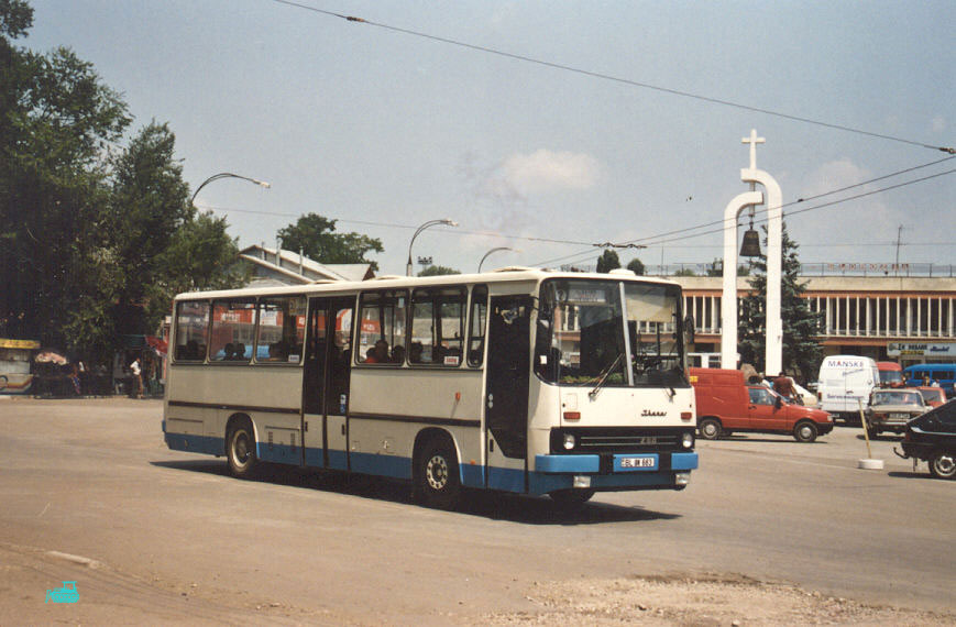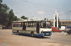Неизвестная модификация Икаруса-260 с немецкими надписями у дверей “Einstieg” & “Ausstieg” на городском маршруте №2 у вокзала. Фото 13.7.2002. |