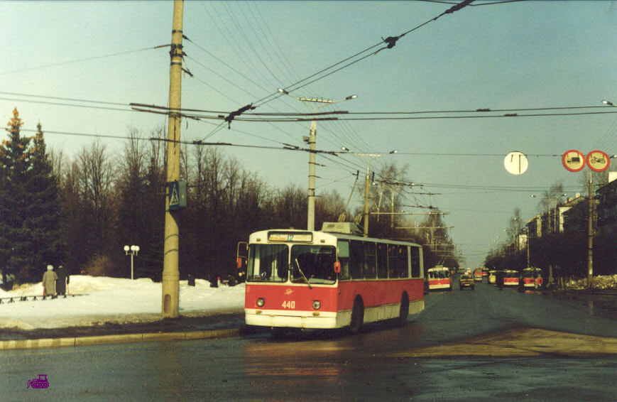 Проспект Ленина у вокзала. Троллейбус 440 (м-т 12) и другие красно-белые. Фото Евгений Хвалынский, март 1999. |