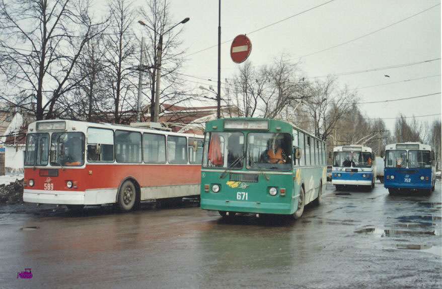 Уникальный случай в Чебоксарах – четыре разных окрасок в кадре. Троллейбусы 589, 671, 767 и 752 на кольце «Агрегатный завод», 2.4.2003. |