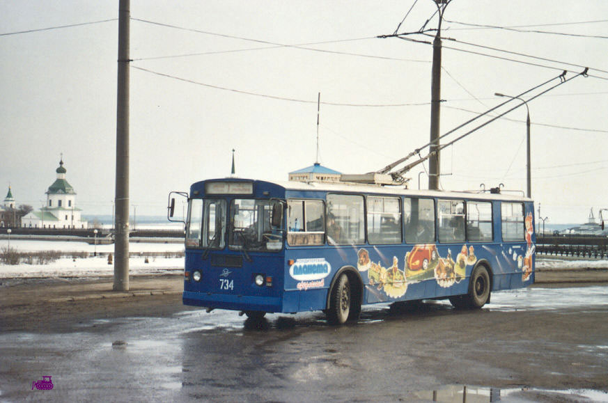 Троллейбус 734 на Красной площади у Волги, на заднем плане Успенская церковь. Фото 2.4.2003. |