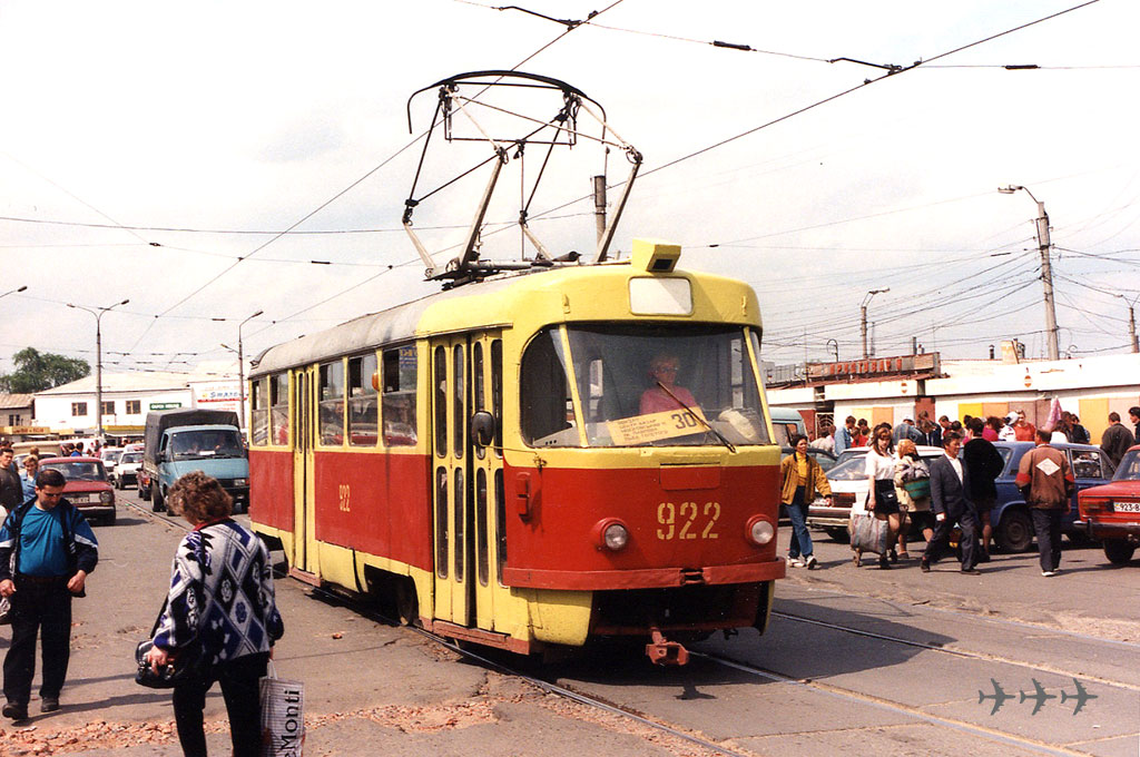Первую Татру Ленинское депо получило в 1979 году, причем этот вагон (зав. номер 168312) – из серии 60 вагонов для Киева (168278...168337). Под номером 901 этот вагон работал одиночкой на 1-м маршруте, а списан уже в Салтовском под номером 746. Фото: АО, 2.10.1998. |
