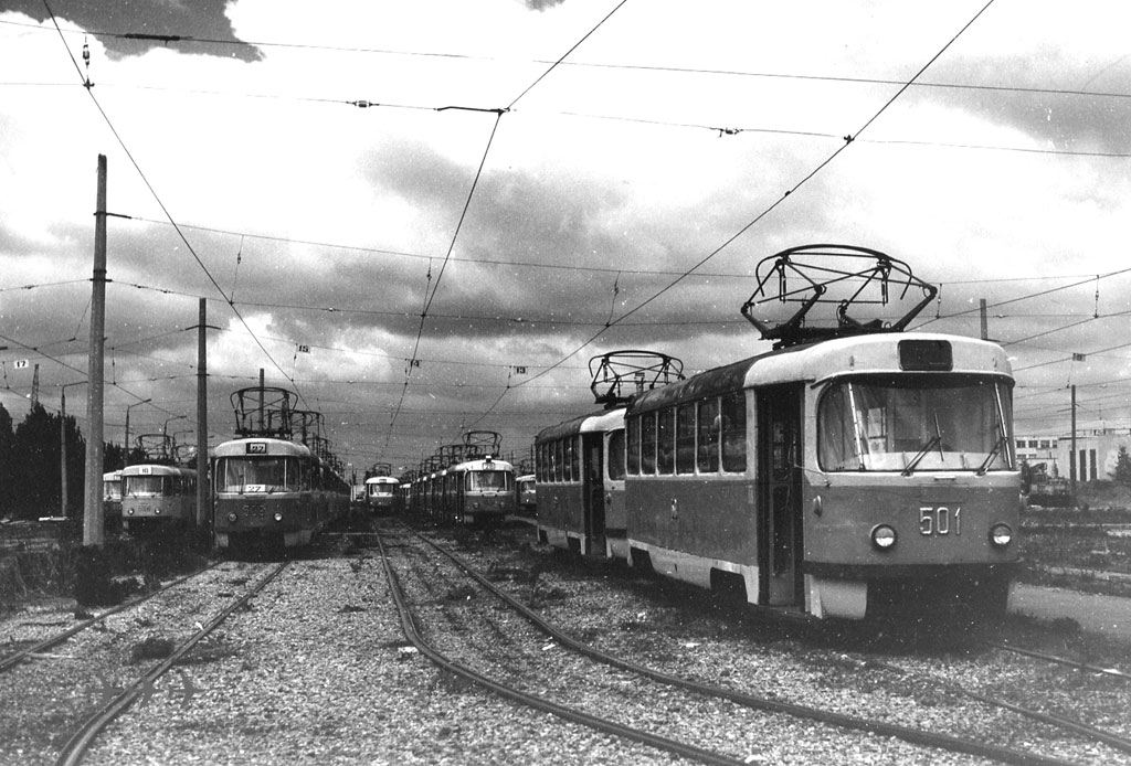 Вагоны 595, 536, 509, 545, 661 и 501+502 в Салтовском депо, крупнейшем по вместимости и территории в СССР. Депо был открыт частично в ноябре 1982 и полностью в 1983 году. 501-510 и 521-536 были переданы из Коминтерновского, 537-574 из Октябрьского и 575-588 из Ленинского депо. В том же году еще добавились 603+604 из Ленинского и 605-618 из Октябрьского. Состав 501+502 – бывшие 1867+1868, зав. 160615+160645. Фото: АО, 20.5.1990. |