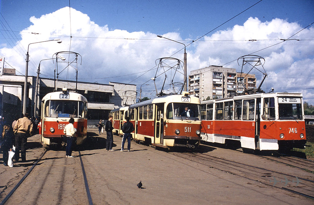 Конечная «602 микрорайон» сегодня обслуживается маршрутами 2, 6 и 22; раньше тут были и №№ 24, 28 и 29. Состав 511+512 (зав. 171521+171532) 23-го маршрута тут оказался случайно. Вагоны 511-520 – первая партия новых вагонов в Салтовском депо. Фото: из собрания Вольфганга Шрейнера, 20.5.1990. |