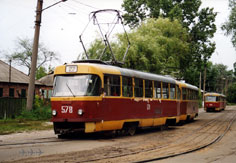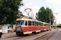 Вагоны 575-588 до передачи в Салтовское три месяца (до ноября 1982 г.) находились в Ленинском под №№ 960-973 (в 1984 г. эти номера снова были заполнены). Фото: состав 578+? (зав. 171502; быв. 963) на 27-м маршруте подъезжает к конечной «Новожаново»; АО, 14.6.2002. |