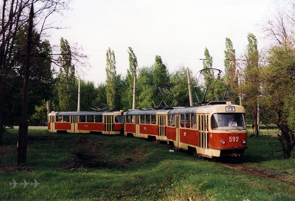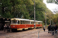 Вагоны 589-602 прибыли в октябре 1982 в Октябрьское депо и в ноябре перевезены в Салтовское. Из них 589-600 были сцеплены в тройники и работали постоянно на 23-м маршруте. Фото: состав 592+593+594 (зав. 171505+?+?); Stefan Spengler, 28.4.1999. |