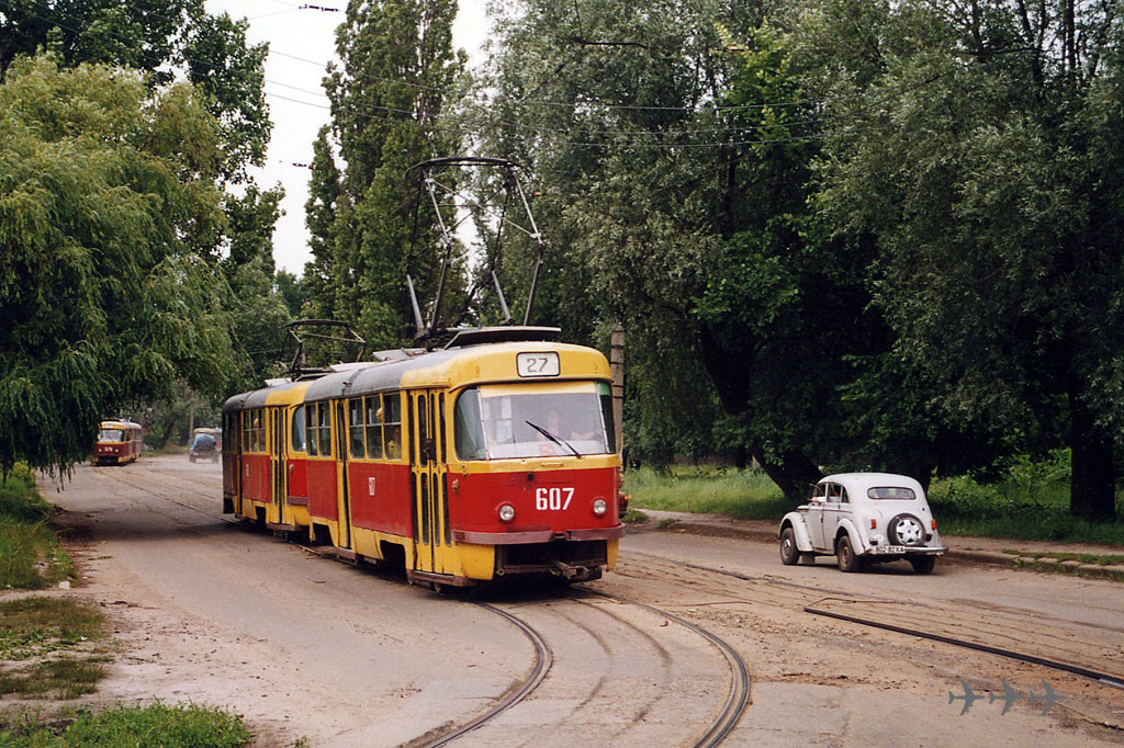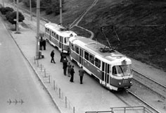 Тройник 688+689+690 (зав. 174682+174681+174671) у станции метро «Им. Масельского». Этот тройник был последний на линии, его расцепили в апреле 2000 г. Фото АО, 2.10.1998. |