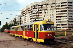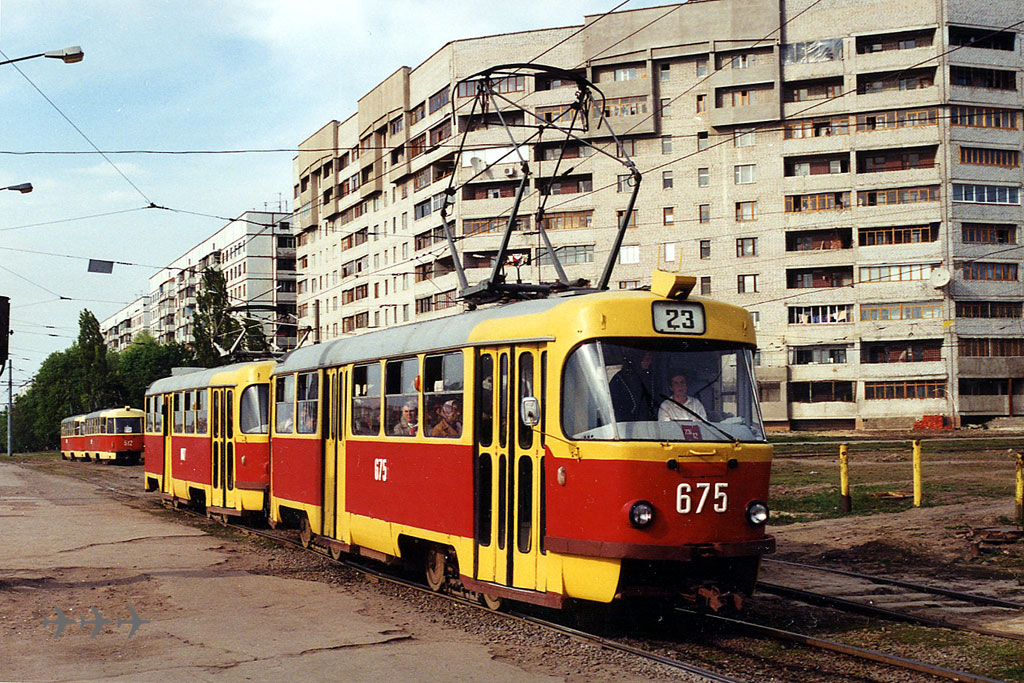 Вагон 675 – последний из 17 Салтовских 1984 года (659-675) – сцеплен с вагоном 687 из партии 676-690 1985 года. Заводские – 173871+174672. Фото: Stefan Spengler, 28.4.1999. |