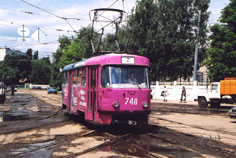 Вагоны 727-733 – бывшие 1843+1844, 1781+1782, 313+314 и 209 (передача 1993 г.), а с 2001 г. Салтовское депо пополнилось Ленинскими вагонами. Эти получили номера от 733 (снова) до 774. Фото: вагон 748 (зав. 169418, бывший 912) у стены 1-го троллейбусного парка; АО, 30.6.2005. |