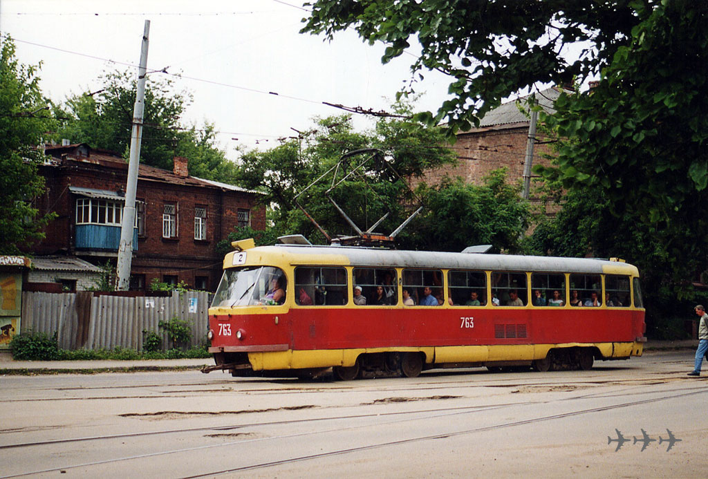 Вагон 763 (зав. 173764, бывший 959) на 2-м маршруте у Ленинского депо. Фото: АО, 14.6.2005. |