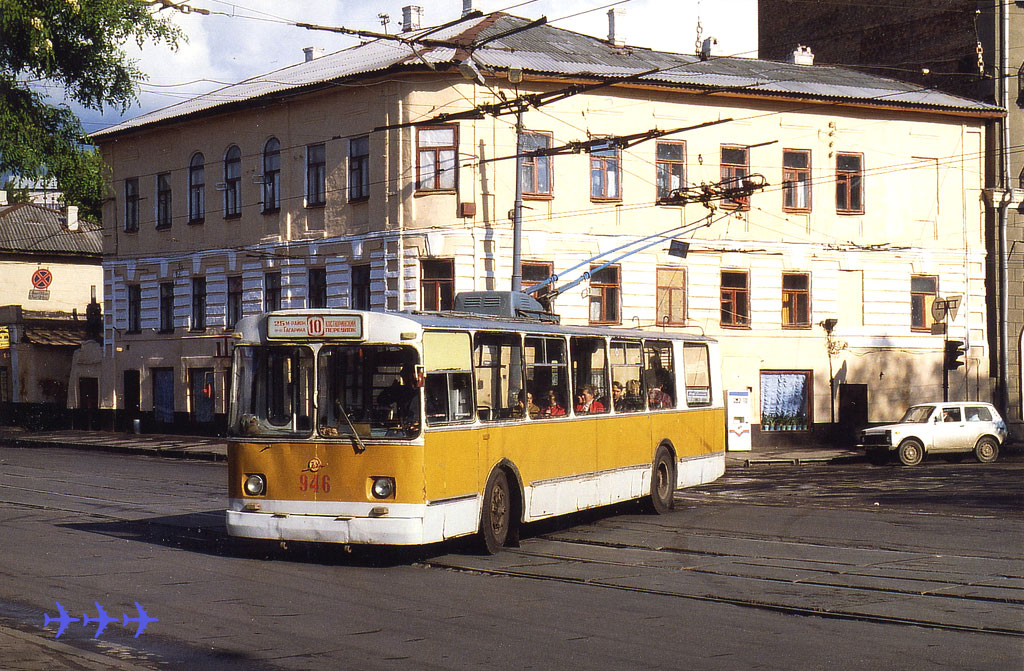 Троллейбус 290 (1987 г.; капремонт на ХЗЭТе) на Московском проспекте у станции метро «Пролетарская». Особенность Харькова: троллейбусы закреплены на одном маршруте, а работают на другом с табличкой «Спецподача...». Фото: АО, 2.10.1998. |