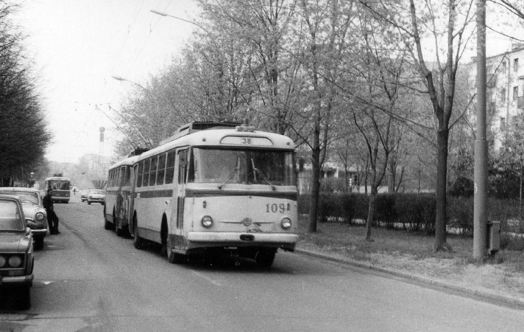 Из 9Тр начиная с мая 1971 г. были образованы 10 сцепок с номерами от 56+57 до 109+110. Фото: состав 109+110 на 38-м маршруте на проспекте Ленина; Бернд Арнольд, 6.5.1982. |