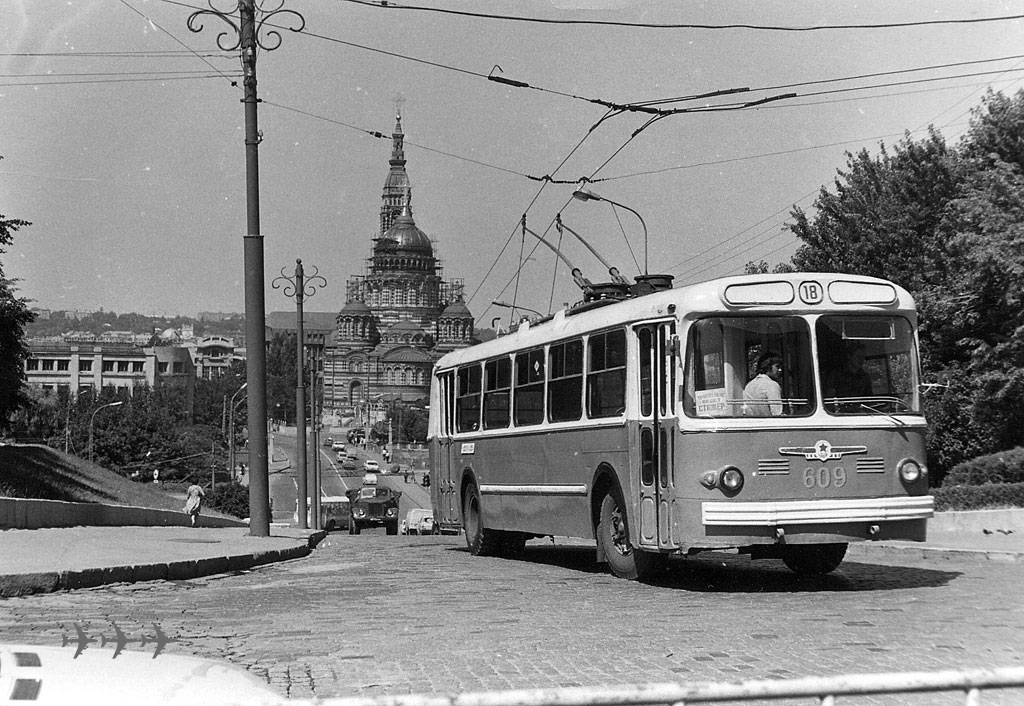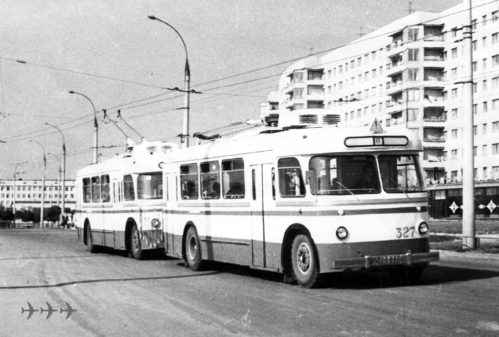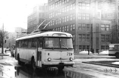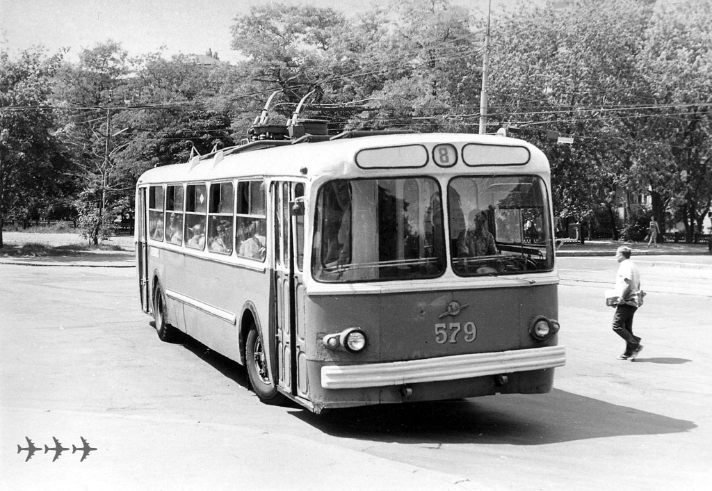 ЗИУ-5 депо №1 имели номера 500-661, депо №2 – 701-921. Фото: троллейбус 579 на 8-м маршруте на перекрестке проспекта Ленина и проспекта "Правды"; Вольфганг Шрейнер, 31.5.1979. |