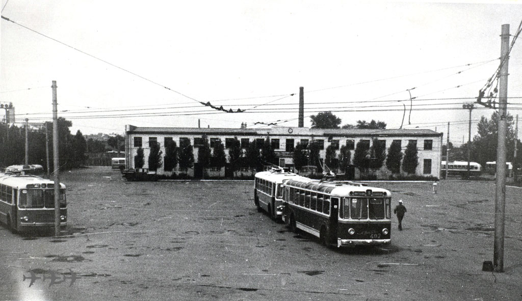 Троллейбусы Киев-2 и ЗИУ-5 на веере в депо №1. В центре – Киев-2 №322 7-го маршрута «Пос. Восточный – Центр», справа ЗИУ-5 №519. Фото: музей ХТТУ, ок. 1965 г. |