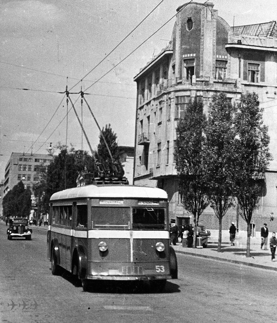 Троллейбус в Харькове начал работать 5 мая 1939 г. Первые машины были ЯТБ-2, номера начались с 50. Фото: троллейбус 53 на улице Либкнехта (ныне - ул. Сумская), Центральный архив кинофотодокументов СССР, май 1939. |