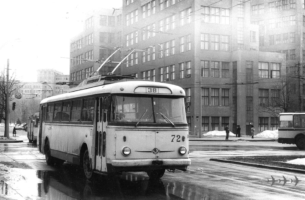 Последние 9Тр работали обычно на 38-м маршруте. 72 – бывшая голова сцепки 72+73. Фото: проспект Ленина; АО, 2.4.1987. |