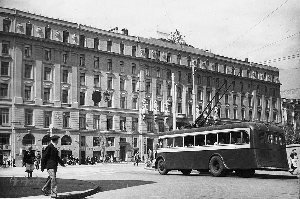 В конце 1940-х часть троллейбусов ЯТБ были модернизированы, используя детали МТБ-82. Фото: троллейбус 54 на Сумской улице, архив кинофото-документов УкрССР, июнь 1951. |