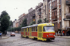 Вагоны 1909 и 1908 на Пушкинской улице. Фото: Hans Oerlemans, 30.6.1987. |