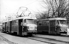Вагоны 327+328 и 1901 на Пушкинской улице. Фото: АО, 2.4.1987. |