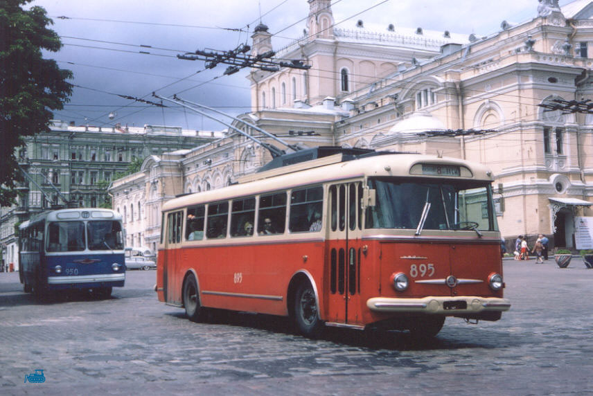 Троллейбусы 895 на 8-м и 950 на 17-м маршруте на улице Богдана Хмельницкого у оперного театра. Сейчас там троллейбус уже не ходит. Все 60 ЗИУ-5 в годах 1969-70 были переданы в Полтаву, Херсон и Житомир. Фото Roy Makewell, июнь 1969. |