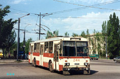 В 1995 году поступили б/у 14Тр 1984 года постр. из Чехии (г. Плзень, там №№ 371-374). В Луганске они стали 246-249. Фото: троллейбус 247 на 51-м маршруте, Андрей Швейде, 2000 г. |