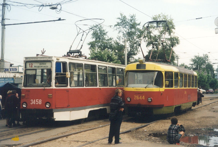 Маршрут №12, когда-то основной Автозаводский, после открытия метро потерял значение и был закрыт. Летом 1999 г. работал временный №12 от вокзала до Игарской ул, повторяя бывший 24-й маршрут. На фото от 12.7.1999: состав 3458+3475 у вокзала, рядом – резервный вагон для 3-го или 4-го маршрута. |