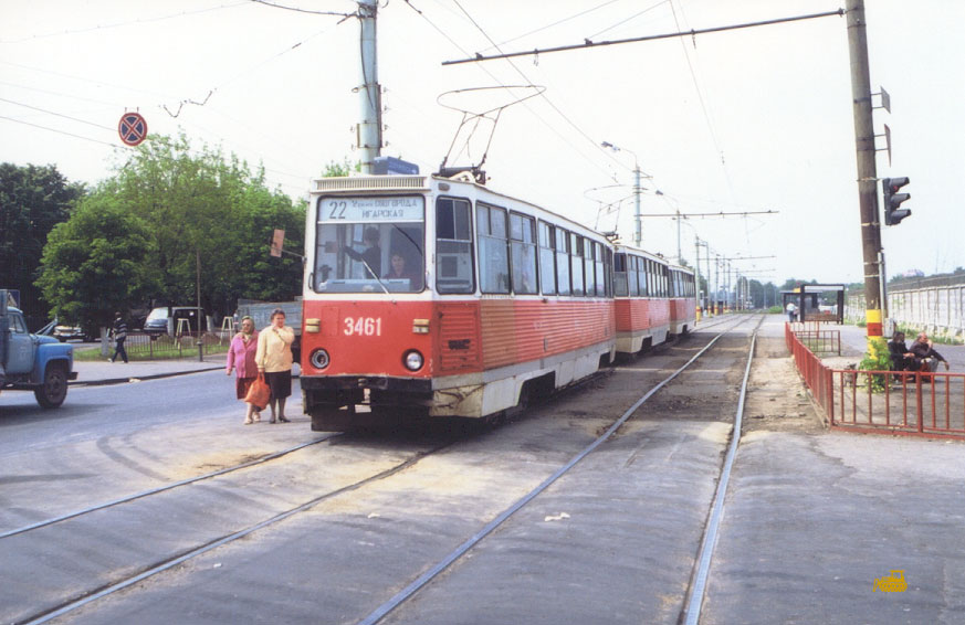 В начале 1990-х тройники из КТМ-5 работали на разных Автозаводских маршрутах. Состав во главе с вагоном 3461 на 22- маршруте, фото Вильфрид Вольф, 28.6.1992. |