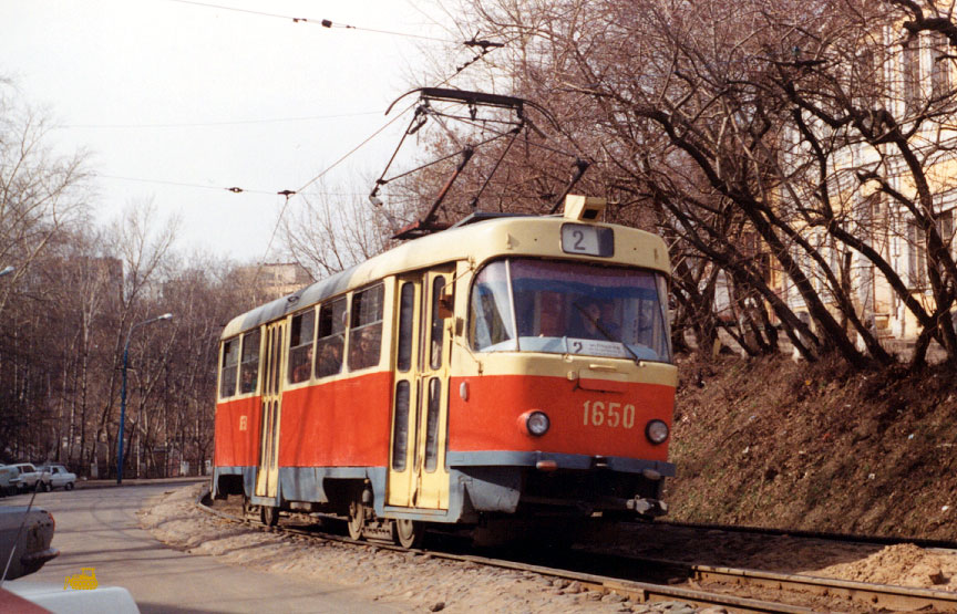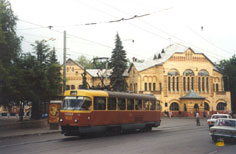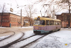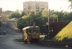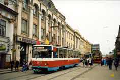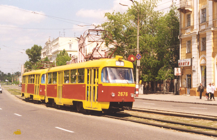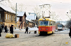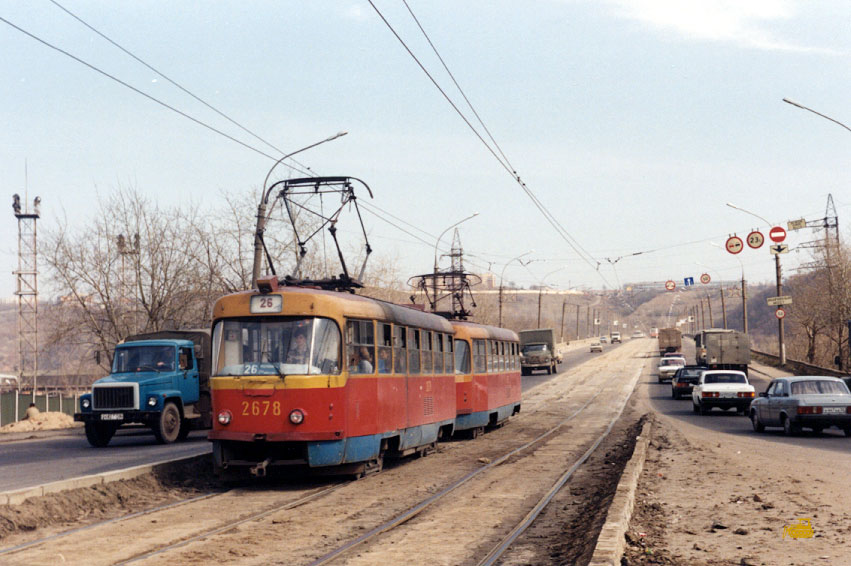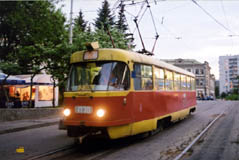 В конце 1990-х многие Татры были капитально отремонтированы на местном ВРЗ. Фото: состав 2676+2677 на 3-м маршруте, Олег Чалков, 1998 г. |