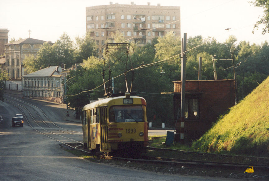 Подъём к Большой Покровской со стороны ул. Добролюбова (Лыковая Дамба). Вагон 1690 на 2-м маршруте. Фото АО, 13.7.1999. |