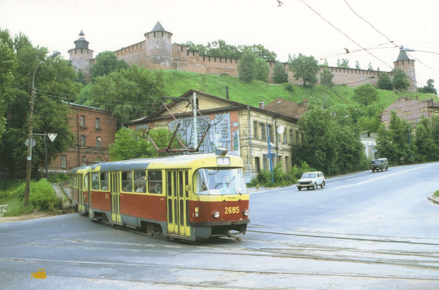 Состав 2685+2684 спускается к Рождественской улице. Слева – кольцо Скоба, когда-то конечная маршрутов №№ 10 (до вокзала), 14, 15 (оба в Сормово) и 16 (в Соцгород). Фото: Вильфрид Вольф, 28.6.1992. |