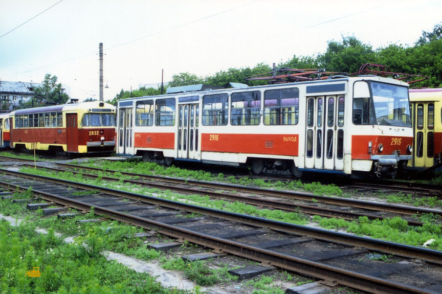 Вагон 2916 временно отстранен от работы за головным 2915. За ним – вагон 2832, который тогда работал одиночкой. Фото в депо 2: Вильфрид Вольф, 27.6.1992. |
