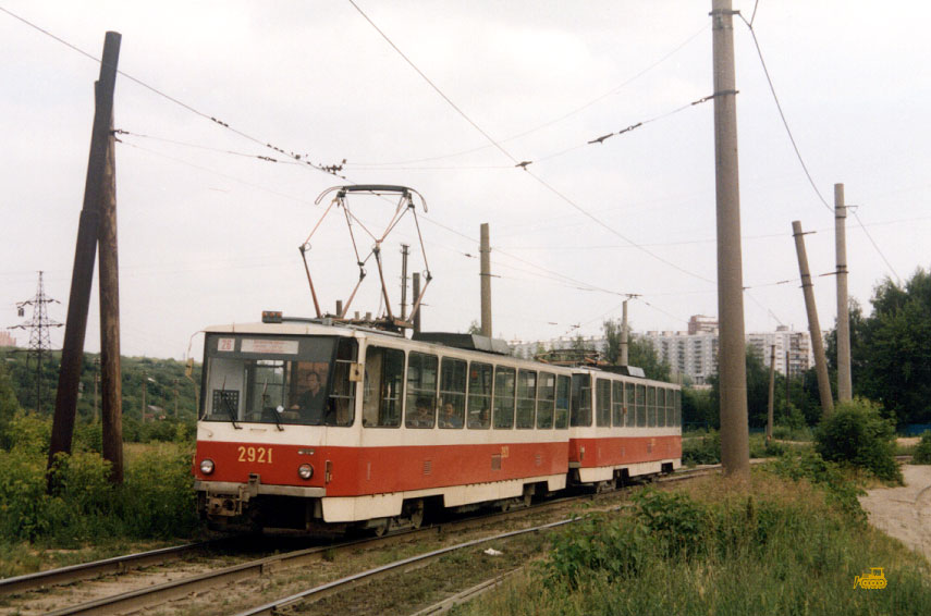 Состав 2921+2922 в заводской окраске отправляется с конечной «Улица Ивлиева» (или Депо №1) на 26-й маршрут. Фото: АО, 30.6.1992. |
