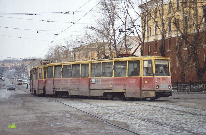 Поезд 359+360 на 4-м маршруте на повороте с проспекта Мира в сторону НТМК. Фото 25.3.2003. |
