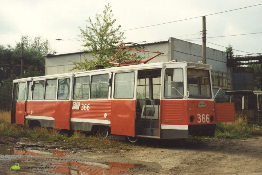 Вагон 366 с эмблемой НТМК на территории простаивающего вагоноремонтного завода в Перми 25.9.1997. Этот вагон еще вернулся в Нижний Тагил. |