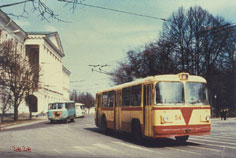 Последние 16 ЮМЗ-Т1 в Полтаве (№№ 53-62,64,65,69-71,83) имели одинаковую заводскую окраску. Троллейбус 54 (зав. 96402 или 96415) у Корпусного сада. Фото АО, 10.5.1999. |