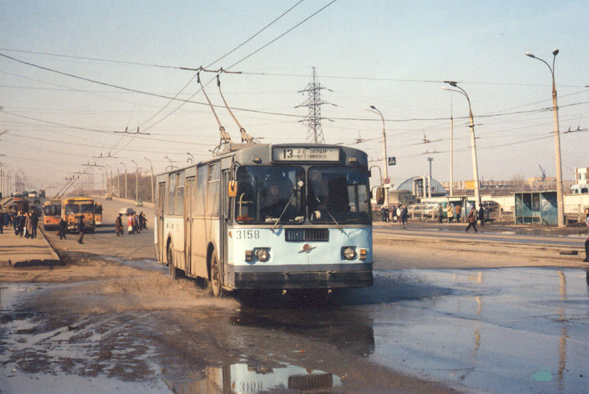 Троллейбус 3158 в заводской окраске на 13-м маршруте у станции метро «Кировская». Фото АО, 6.4.1994. |