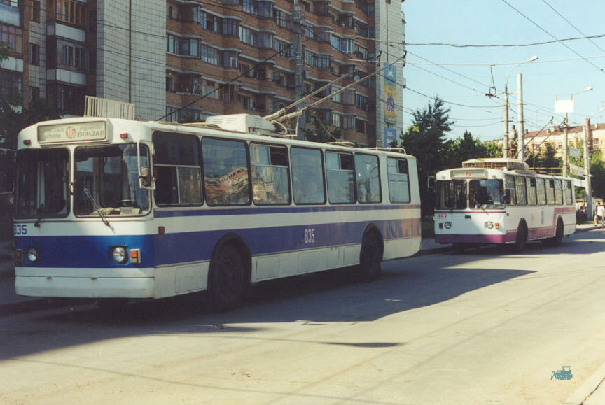 Троллейбус 835 в новой стандартной окраске 1-го депо (в самом деле объединенного 1-го и 2-го). За ним – АКСМ-101 897 в заводской окраске. Фото: Костя Климов, 2000 г. |