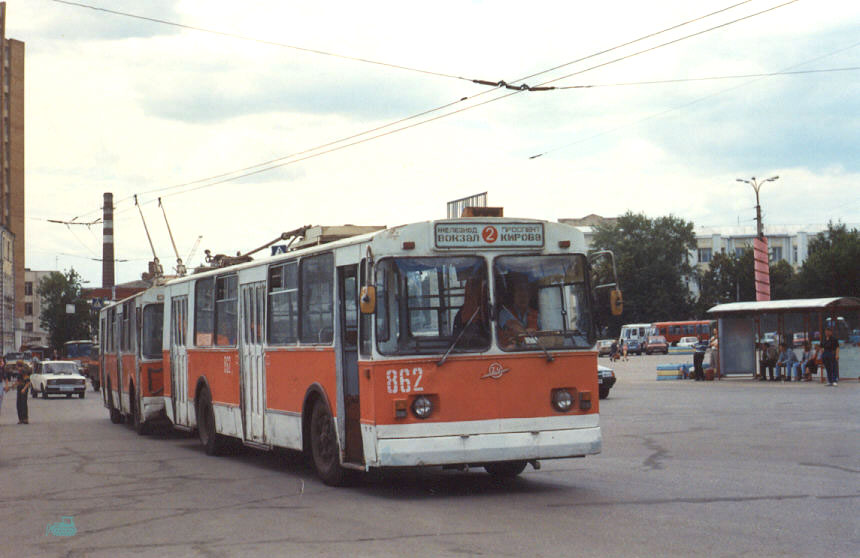 Поезд 862+863 на Привокзальной площади. Поезда работали постоянно на 2-м маршруте. Фото АО, 8.6.1995. |