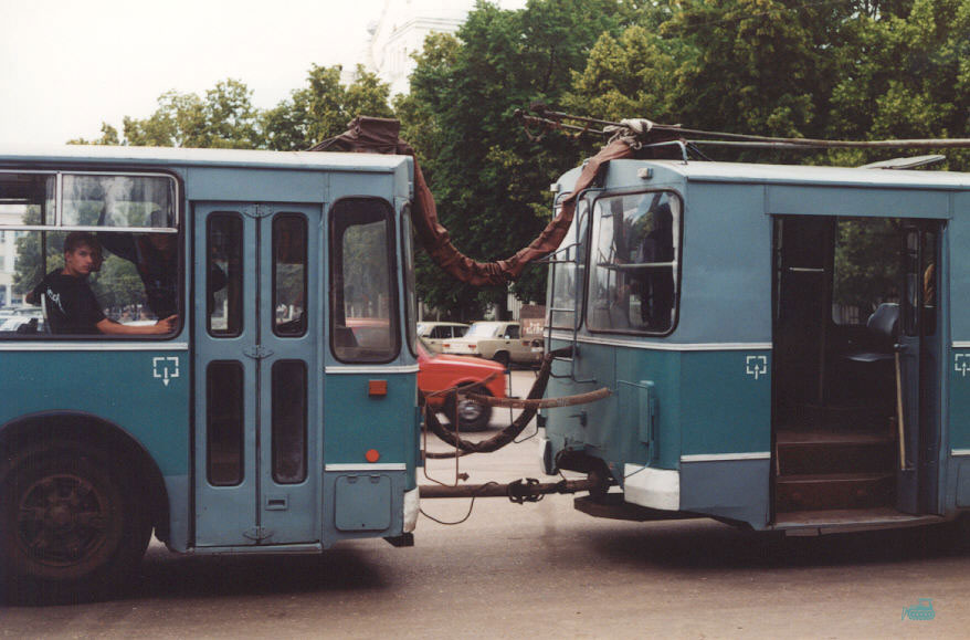 Этот троллейбус был построен Самарским заводом транспортного машиностроения в 1997 г., используя детали и даже эмблему ЗИУ. Фото АО, 31.8.1997. |