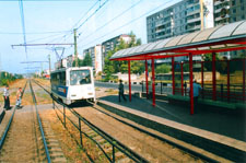 Следующая остановка - "БСИ". Здесь находится кольцо маршрута №2, который ходит только в час пик. В дневное время вагонов этого маршрута мне не встретилось. Павильоны здесь тоже старые. Вагон №84 (1983 г.) возвращается в город. На заднем плане видно начало одной из трех петель, которые созданы на линии для обхода автомобильных развязок. 12.9.2005. |