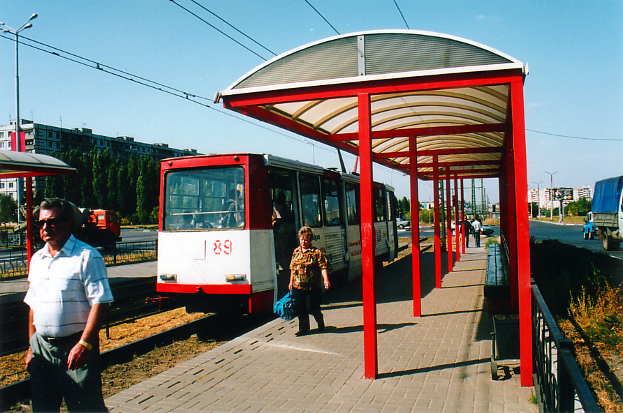 На той же остановке, вагон №89 (1983 г.). Здесь прекрасно видна изящная конструкция остановочных павильонов. 12.9.2005. |