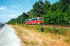 Трасса за пределами Старого Оскола проходит через леса, поля и села. Вагон №39 (1978 г.) приближается к остановке "Незнамово". На заднем плане за лесом видны городские высотки. Здесь также находится симпатичная церковь, но в один кадр с трамваем влезть она не пожелала. 12.9.2005. |