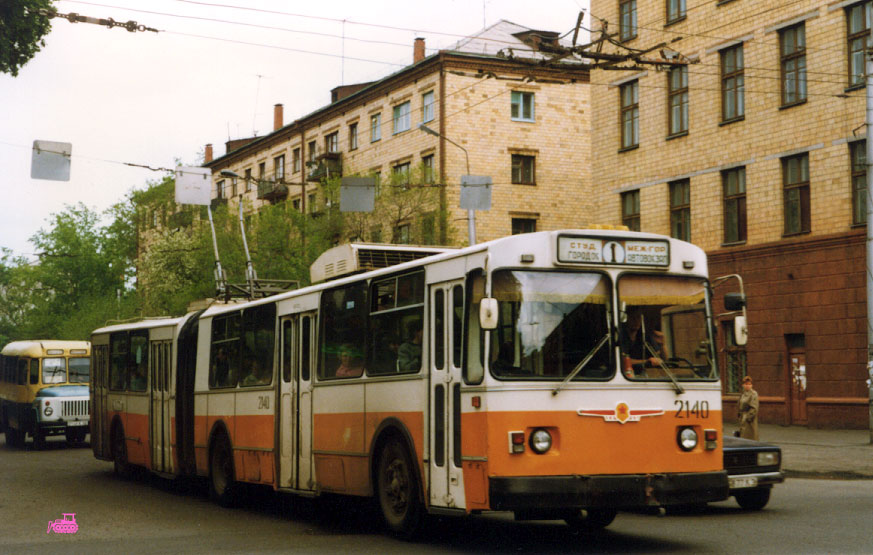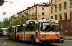 С 1992 г. рядом с тиристорными ЗИУ-682Б появились ЗИУ-683В1 (с РКСУ, но более мощными двигателями). Обычные ЗИУ-683В заменили 683Б в производстве в 1993 г. Общую серию заводских номеров 683Б и 683В1 закончили ЗИУ-683В1 2140 и 2141 в Красноярске (заводские №№ 781 и 782). Фото АО, 30.5.1996. |