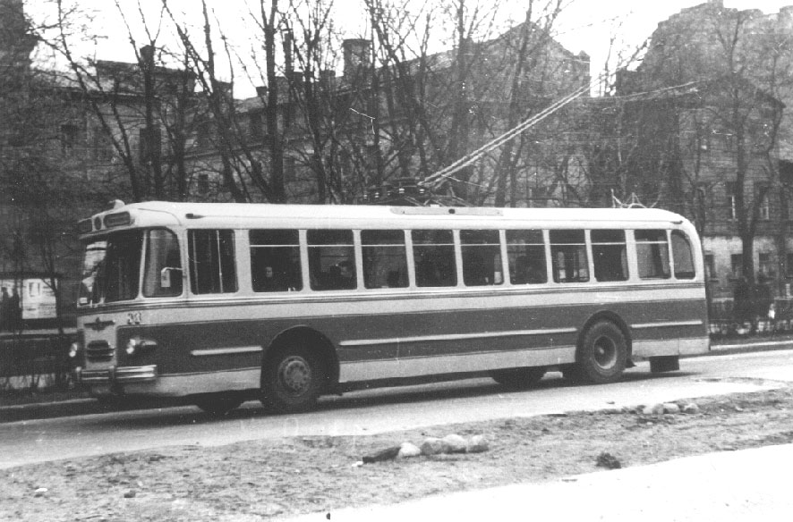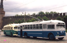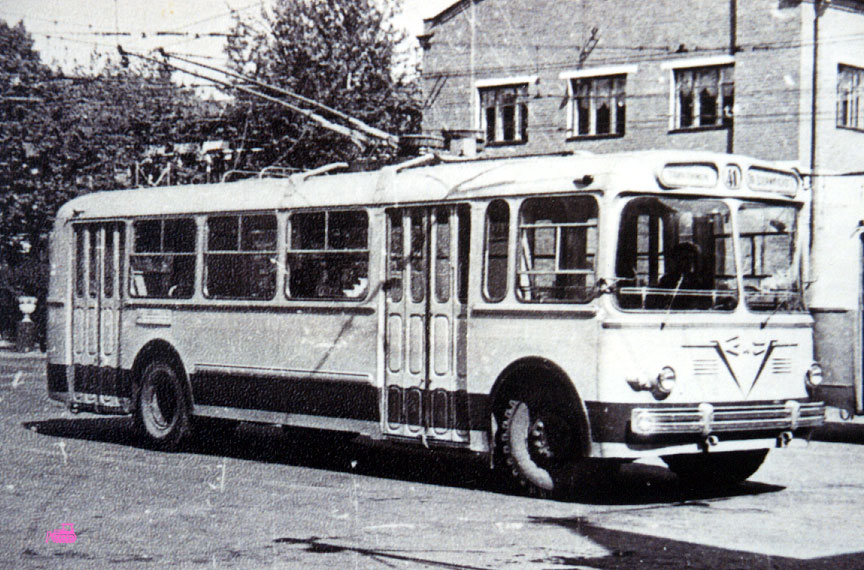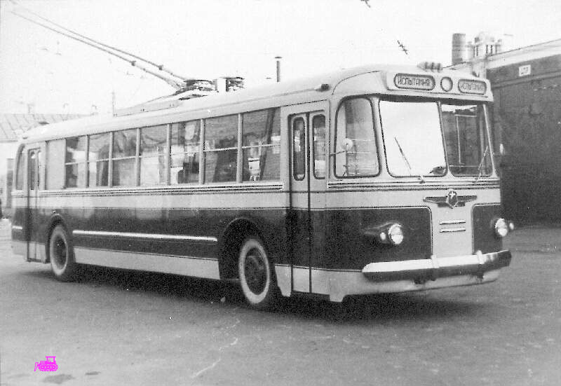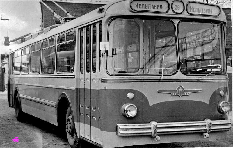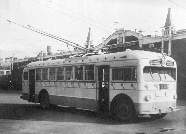 | Троллейбус ТБУ-1 – прототип ЗИУ-5 – первый (и вроде бы последний) советский пассажирский троллейбус с двигателем, расположенным в заднем свесе. Этот двигатель и послужил одной из главных причин раннего списания всех ТБУ-1 – ошиблись с длиной заднего свеса и расчётом балансировки по массе, и на не очень ровных дорожных поверхностях машину перевешивало назад. На фото из коллекции Александра Шанина: испытания в Москве в 2-м парке, 1955 (?) год. | |