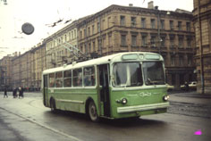 Новенький ЗИУ-9 с номером 1414 в Ленинграде на 5-м маршруте. Схема окраски у первых ЗИУ-9 была одинаковая, но цвета менялись: верх был желтый, белый или серый, низ – красный, оранжевый, зеленый или темно-серый. Фото: Roy Makewell, 1973 год. |