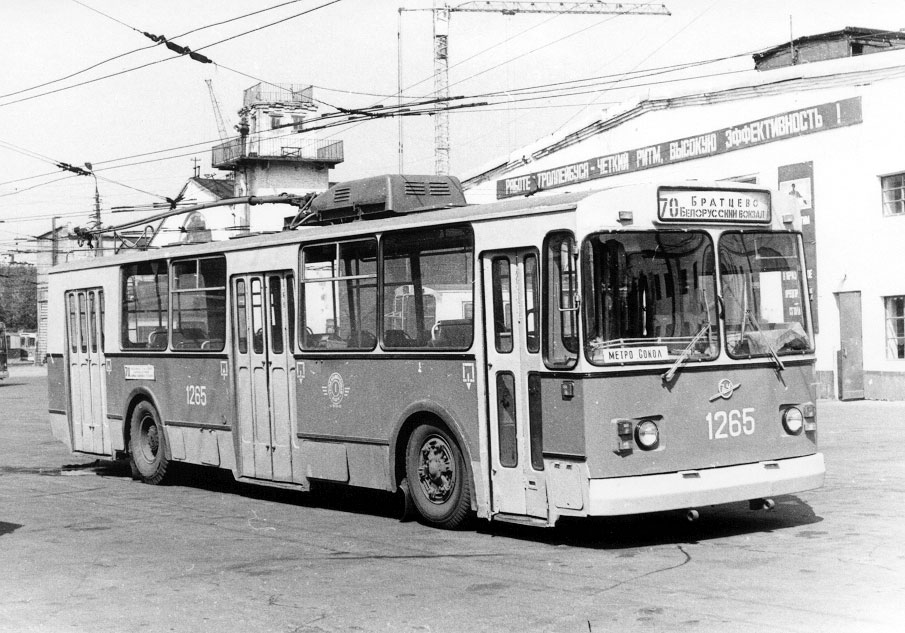 Один из двух ЗИУ-684Б в Москве в 1-м парке – троллейбус 1265 в стандартной красно-желтой окраске. В отличие от ЗИУ-682В этот тип имел ТИСУ. Есть сведения, что машина разрабатывалась совместно с кафедрой Электротранспорта и кафедрой Промышленной Электроники МЭИ по заказу Белграда. Фото: Александр Шанин, 1986 г. |