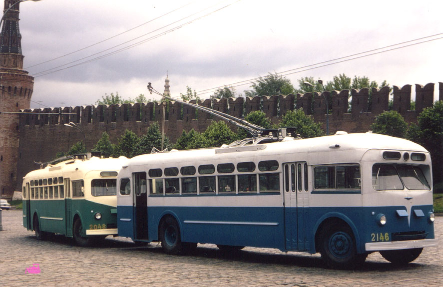 Обычные МТБ-82 2146 и 2048 (постр. 1961 и 1959 г.) после капремонта ждут презентации у Кремлевской стены. Зачем и кому – неизвестно. Эмблема у 2146 – не настоящая, а с раннего МТВ-82 конца 1940-х. Фото: Roy Makewell, 1969 год. |