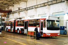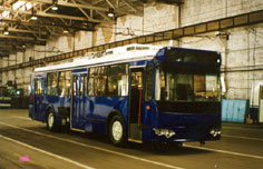 Новейшая модель Тролзы – 527505, то есть «Оптима». Это почти новая модель, сохраняющая лишь некоторое сходство с 527500. Больше нету тумбочек в салоне, задняя площадка теперь высокая, новая кабина, новый пульт управления, арка жёсткости над передним мостом, новые человеческие двери, и т.д. В сентябре 2003 г. первые Оптимы были почти уже готовы к отправлению в Москву. Фото АО, 19.9.2003. |