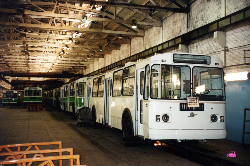 В 2000 году в производстве были уже ЗИУ-682ГОМ (016; сзади бело-сине-полосатые машинки на стапелях) и ГОР (018). Синий и бирюзовый троллейбусы слева – либо ГОА/012, либо ГОР/018. Белый троллейбус права – один из Тролза 5264-01. Фото: Костя Климов. |