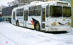 Троллейбус Тролза-52643, совместная работа Тролзы, Сименса и завода «Динамо», в 1997-98 годах прошел испытания в Москве (под номером 5000) и Саратове и вернулся на завод. Фото: Костя Климов, Москва, январь 1998. |