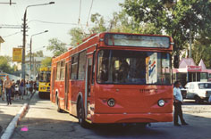 «Столицы» встречаются кроме Москвы еще в Ростове, Пензе, Душанбе, а также в Сызрани. Вероятно именно этот красный троллейбус стал номером 001 в Сызрани. Фото: Костя Климов, Энгельс, 18.8.2002. |